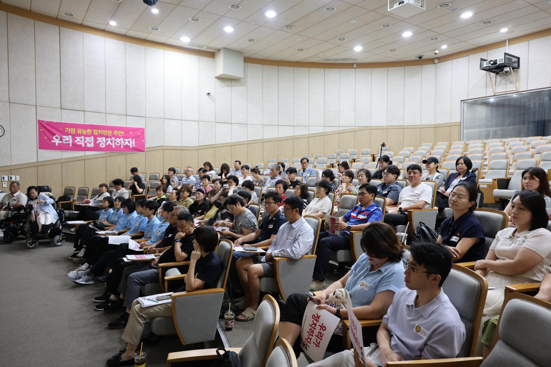 이어 이지영 사무국장의 ‘주민직접정치 운동 사례’와 권민경 공동조직위원장의 ‘7회 주민대회 전개 과정 보고 및 이후 계획’에 대한 의무교육이 진행되었습니다.